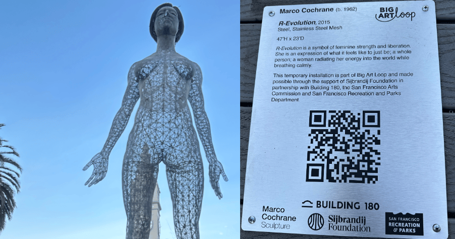 As we close out Women’s History Month, I’m reminded of art I spotted on Embarcadero Plaza in San Francisco during Super Bowl weekend (apologies for not capturing the full sculpture in this photo). R-Evolution, created by Marco Cochrane, included a description: “She is an expression of what it feels like to just be: a whole person; a woman radiating her energy into the world while breathing calmly,” the text reads.